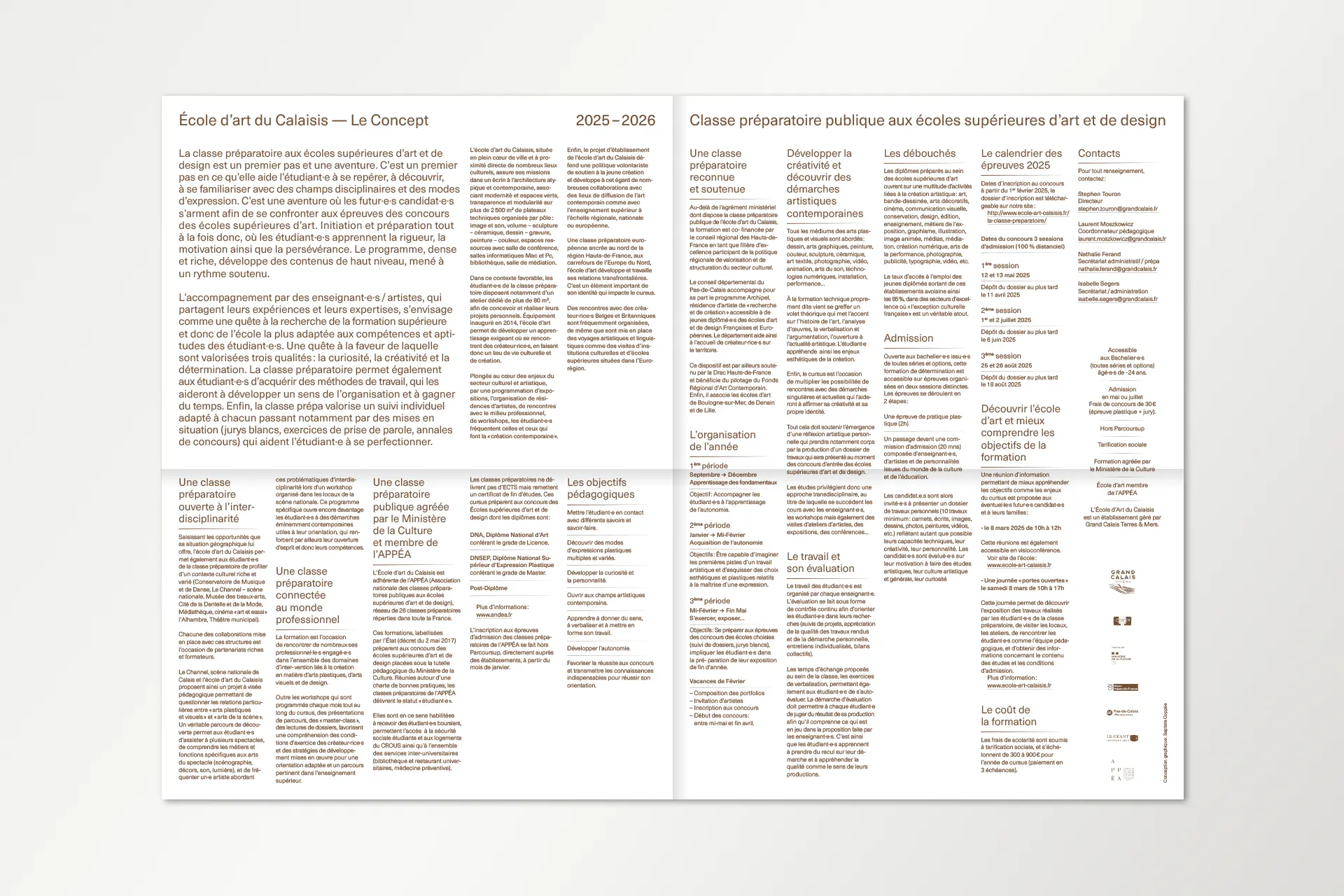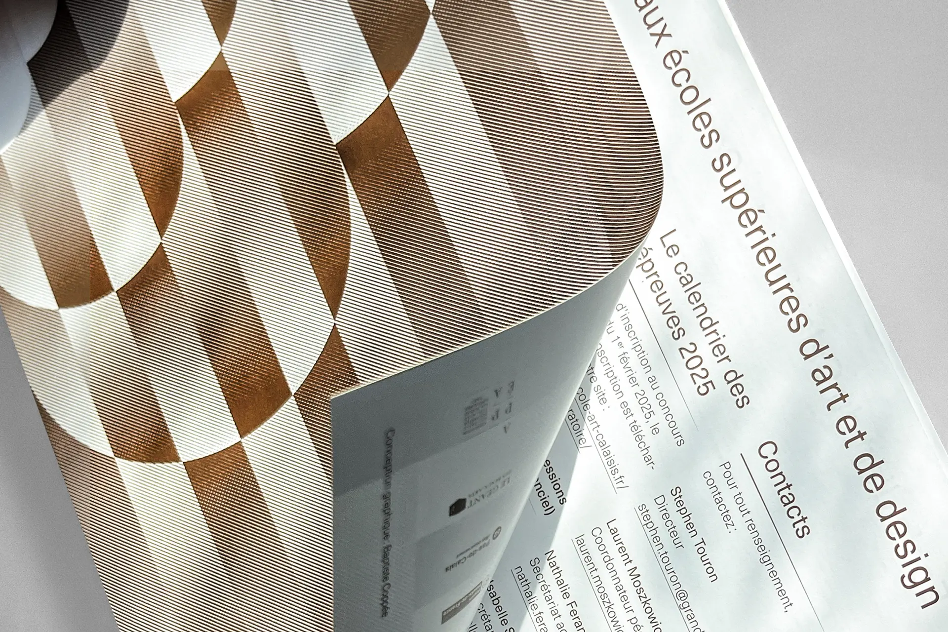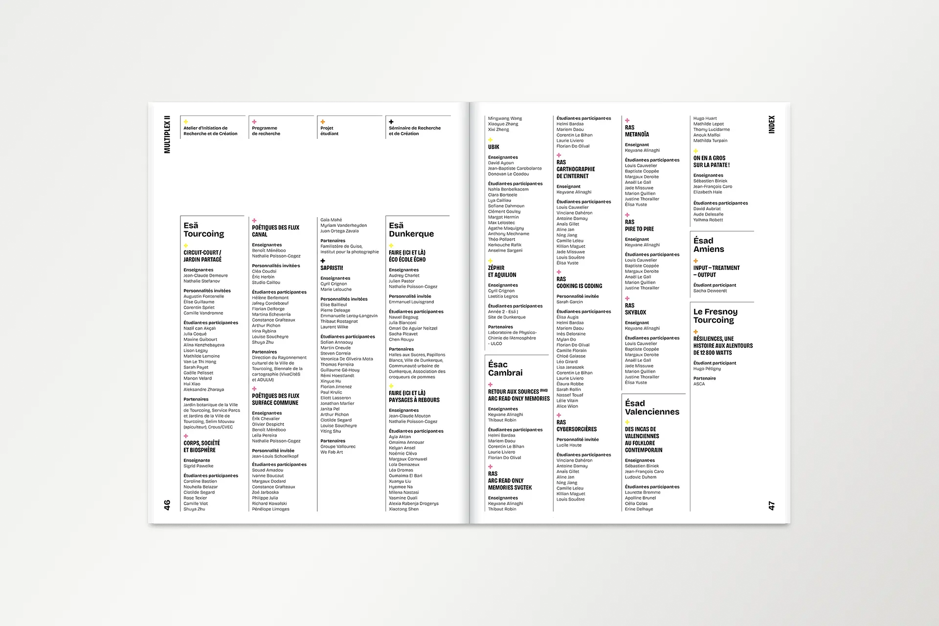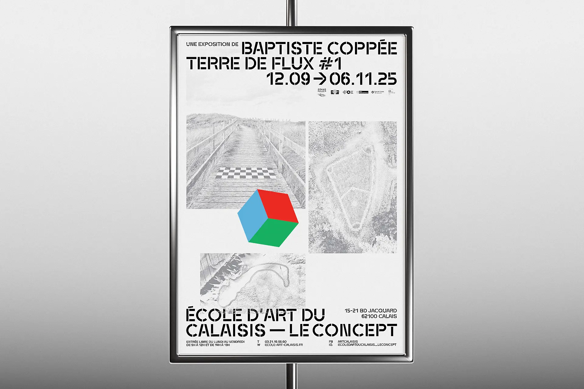PresseTERRE DE FLUX #1Année2025DescriptionExposition, Affiche, FlyersLieuÉcole d'art du CalaisisTerre de flux est une résidence de création co-organisée par l'École d'Art du Calaisis et l'École d'art et de communication de Cambrai. Cette restitution expose les productions et les recherches développées lors de celle-ci. La communication visuelle de cette exposition est une carte blanche donné au designer lauréat.COURS ET ATELIERS 25/26Année2025DescriptionÉdition, 110 x 200 mm, Pelliculage brillant sur couvertureClientÉcole d'art du CalaisisDans la continuité du dépliant, le livret met en évidence la dentelle de cuivre visible sur la façade de l'école. Celui-ci est couvert d'un pelliculage brillant rendant compte de la brillance du métal à tons dorés.CLASSE PRÉPA 25/26Année2025DescriptionDépliant 4 plis, 240 x 175 mm, vernis UVClientÉcole d'art du CalaisisL’École d’art du Calaisis est située au cœur de la ville de Calais. Elle se distingue notamment par son architecture et par la dentelle de cuivre qui recouvre sa façade. Le dépliant entre en résonance avec l’architecture grâce à des dégradés d’une nuance Pantone. Une forme se développe progressivement au fil du dépliage de l’objet, illustrant ainsi l’évolution de l’étudiant à mesure qu’il découvre l’école et ses enseignements.GOLF DE BLÉRIOT-PLAGEDate2024DescriptionPhotographie, installationLieuCalaisDepuis plusieurs années, Blériot-Plage accueille de nombreux projets d’aménagement urbain, dont celui d’un terrain de golf qui n’a finalement pas abouti. Pourtant, la plage elle-même peut être exploitée sans être dégradée. Les dunes, sculptées par le vent et les marées, sont marquées par un ratissage qui permet l’émergence d’un golf naturel prêt à l’emploi.BASEBALL D'AUTOMNEDate2024DescriptionPhotographie, installationLieuCalaisLa période automnale invite à parcourir la ville, tapissée de feuilles mortes. Ces déchets, habituellement éliminés, peuvent devenir un matériau de construction pour des espaces et des aménagements naturels biodégradables. Inspiré par la forme d’un espace vert, un terrain de baseball émerge de la structuration des feuilles environnantes.COURSES EN CALAISISDate2024DescriptionSérie, Photographie, installationLieuCalaisÀ l’aide de bandes de tissu préalablement conçues pour imiter un damier, l’espace urbain peut être transformé en champ de course par la seule présence de cet élément graphique, et ce, sans marquer, dégrader ou dénaturer le paysage. Ces installations in situ redéfinissent nos usages de la voie publique à travers l’imaginaire sportif.SKATEPARKDate2024DescriptionPhotographie, installationLieuCalaisSkatepark est une série de photographies prises sur le skatepark de Calais, l’un des plus grands de France. Les formes épurées du mobilier facilitent sa réappropriation en lui donnant de nouvelles fonctions. Initialement conçu pour les engins roulants, cet espace voit ses possibilités s’élargir lorsqu’on y utilise un ballon ou d’autres accessoires de jeu, transformant ainsi cet espace figé en un lieu de création sans limite.EN PISTE!Date2024DescriptionPeinture, piste de jeuxLieuNiergniesTracée sur une ancienne piste aérienne d’une longueur de 200 mètres, En piste! est une accumulation de compositions géométriques inspirées de jeux populaires, tels que des jeux de balle, de lancer, de course ou encore des jeux de plateau. Ces différentes typologies de jeux se réunissent et s’entremêlent, offrant de multiples possibilités d’interprétation et d’utilisation. Les participant·es sont libres d’interpréter ces espaces, de les investir et d'y créer leurs propres règles.COURS ET ATELIERS 24/25Date2024DescriptionÉdition, 110 x 200 mmCommanditaireÉcole d'art du CalaisisLe livret 2024-2025 à destination des futur·es adhérent·es de l’École d’art du Calaisis est imaginé comme étant un objet ludique et accessible à un public de tout âge. Chaque tranche d’âge est assimilée à une forme géométrique et une couleur, en écho aux jeux de construction mais également à des gomettes. De leurs déploiements émergent des images propres à chacun·e.LES NOUVEAUX STADESDate2024DescriptionEspace de création collectiveLieuAgglomération de CambraiCollaborationLes Nouveaux Stades ont pour objet de favoriser la réappropriation de l’espace public par les habitant·es d’un quartier, grâce à l’invention de nouveaux rituels inclusifs. Au croisement du foot de rue, du hip hop et du jeu vidéo, Les Nouveaux Stades accueillent des performances chorégraphiques impliquant sportif·ves amateur·es, danseur·euses et habitant·es.REVUE MULTIPLEX IIDate2024DescriptionÉdition 240 x 320 mmCommanditaireAssociation PolarisFaisant suite à la journée Multiplex II en décembre 2023, cette revue éponyme rend compte de chaque événement ainsi que du travail des étudiant·es de chaque école représentée. L’ouvrage met en lumière les recherches et les questionnements des écoles d’art des Hauts-de-France.MULTIPLEX IIDate2023DescriptionIdentité visuelle, signalétiqueCommanditaireAssociation PolarisL’identité visuelle de Multiplex II se manifeste par une explosion éléctrisante de couleurs chaudes. Cette étincelle émane de la rencontre entre les écoles d’art réparties dans les quatres coins de la région Nord. Celle-ci témoigne du dynamisme constant de l’événement à travers la présentation des diverses pratiques et programmes de recherches.ASSOCIATION POLARISDate2023DescriptionLogotypeCommanditaireAssociation PolarisCe logotype allie le concept de géolocalisation, représenté par une boussole, et le rayonnement de l’association représenté par une étoile. Basé sur le nom entier de l’association «Réseau magnétique des écoles d’art publiques des Hauts-de-France», le choix d’une boussole comme instrument magnétique résume la volon