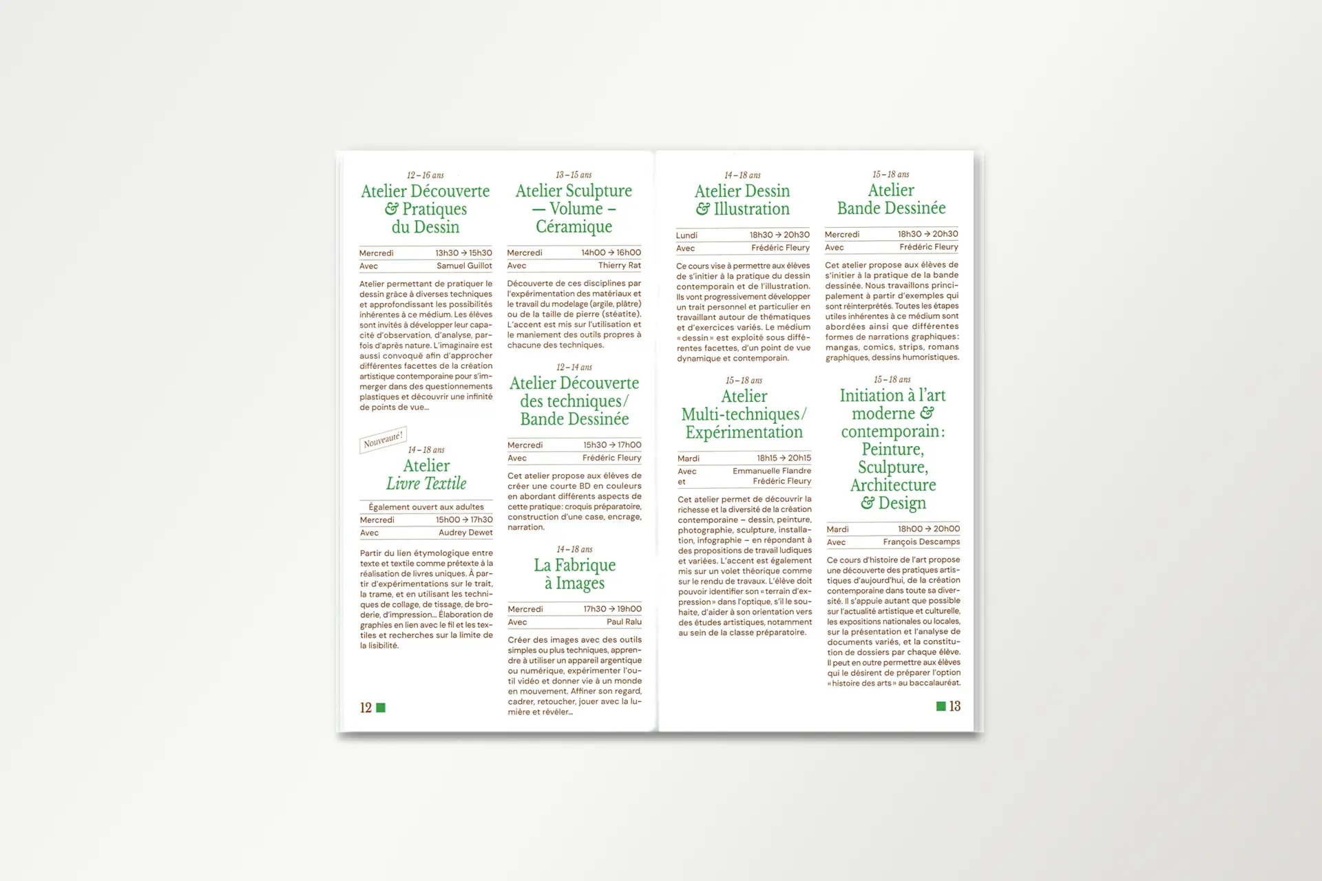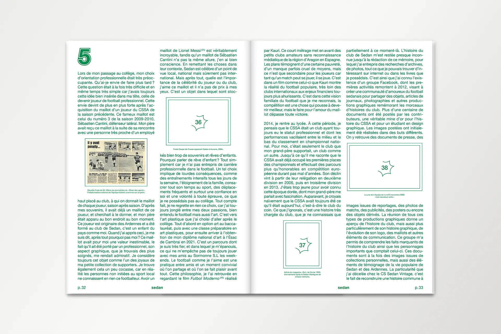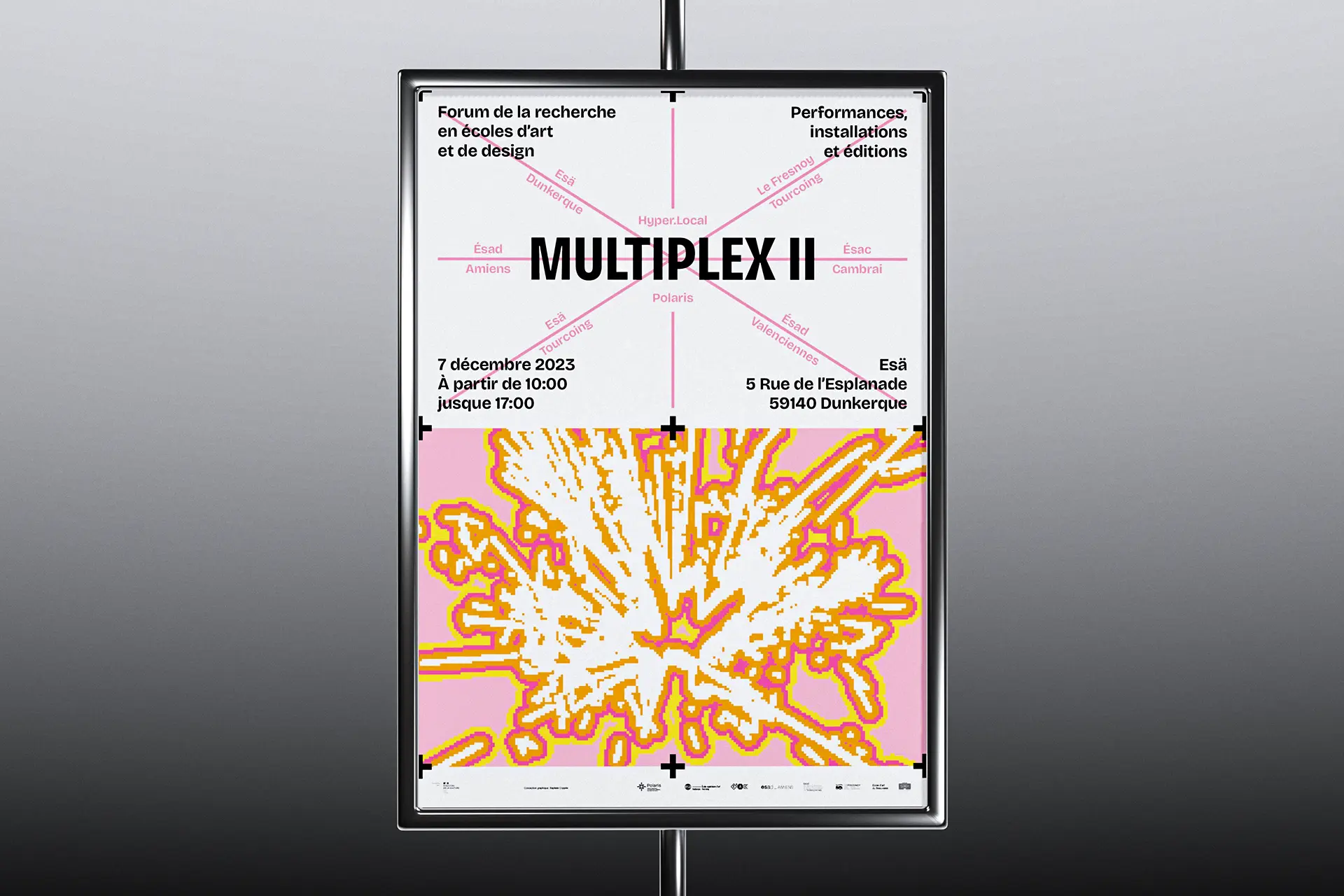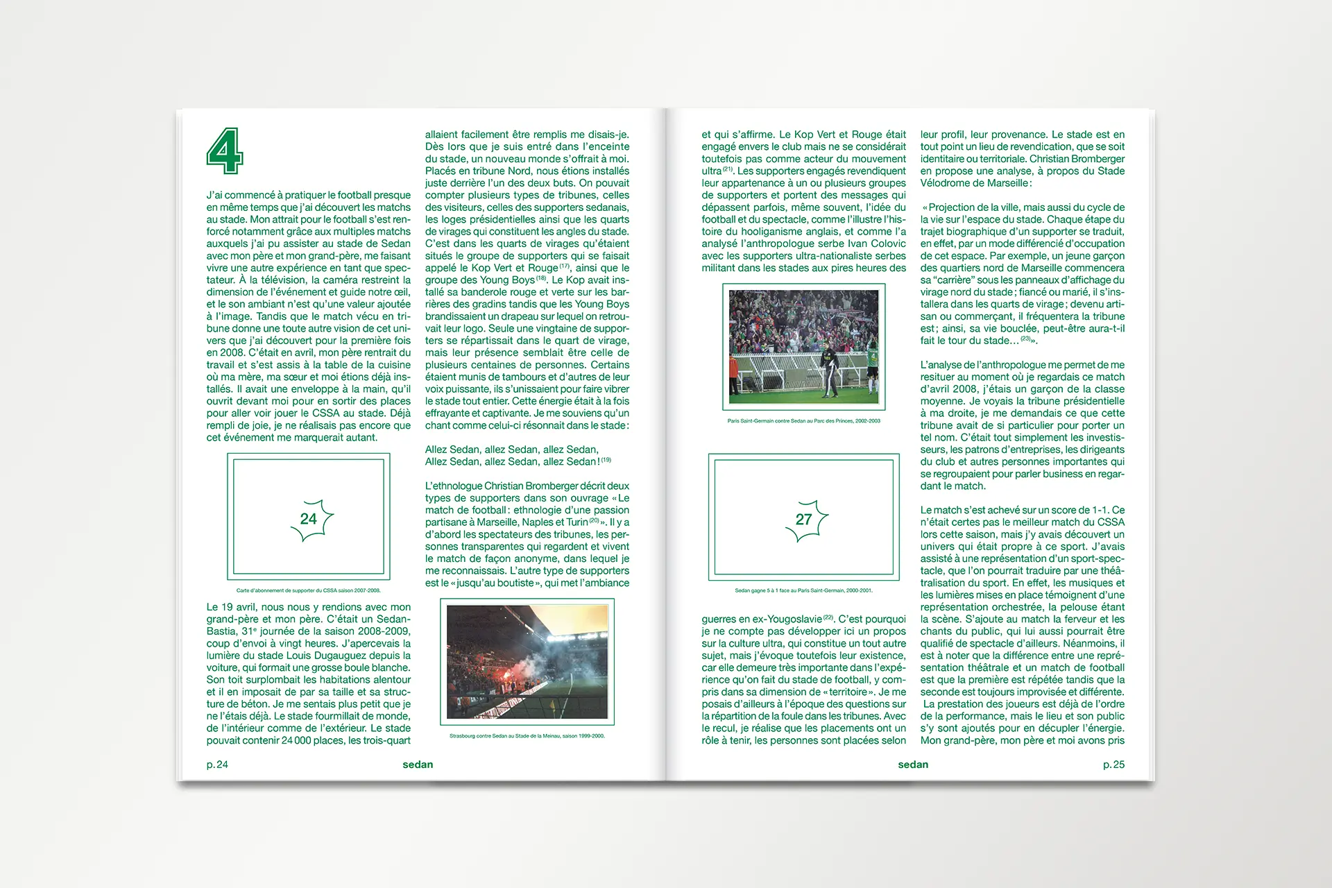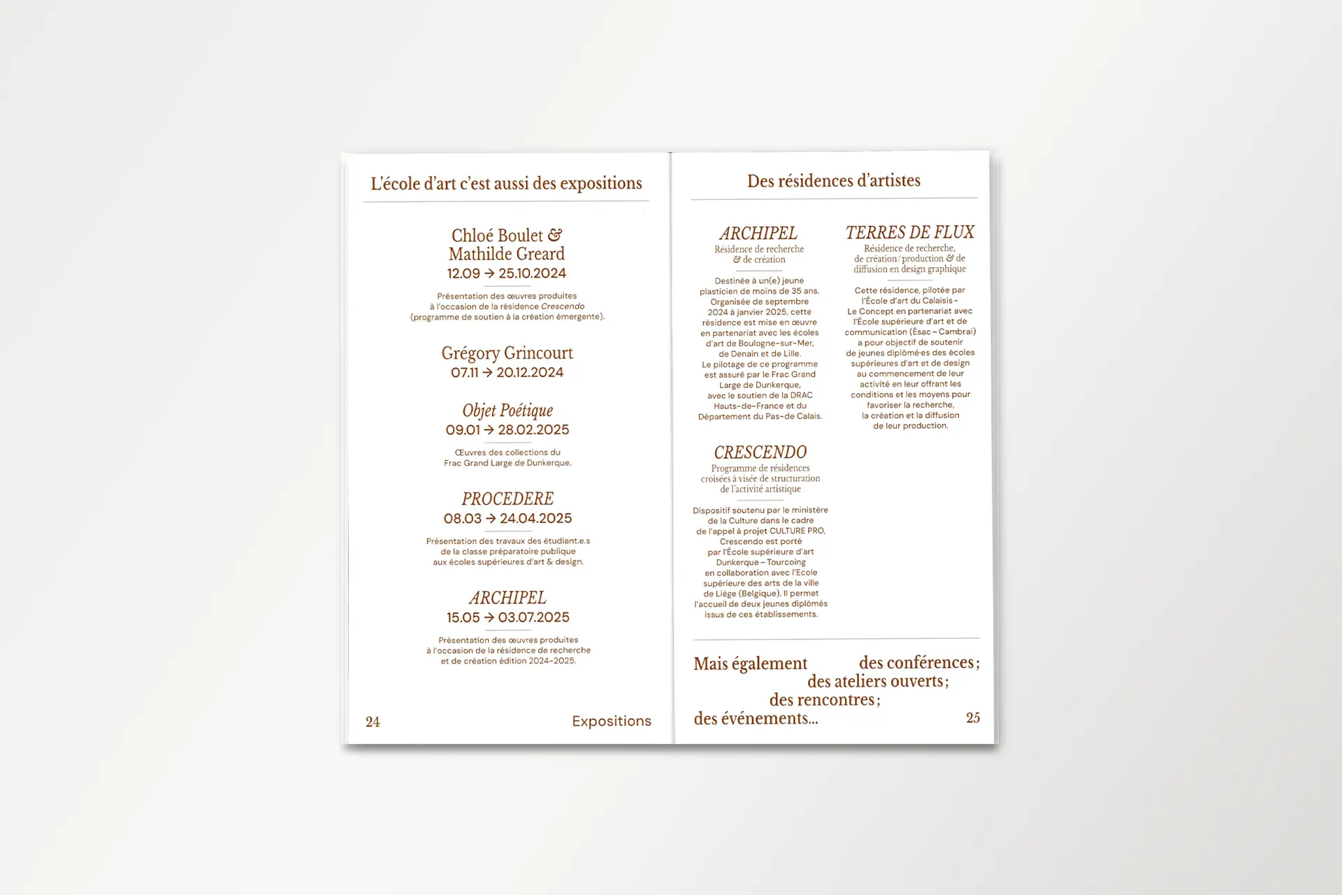 PresseTERRE DE FLUX #1Année2025DescriptionExposition, Affiche, FlyersLieuÉcole d'art du CalaisisTerre de flux est une résidence de création co-organisée par l'École d'Art du Calaisis et l'École d'art et de communication de Cambrai. Cette restitution expose les productions et les recherches développées lors de celle-ci. La communication visuelle de cette exposition est une carte blanche donné au designer lauréat.COURS ET ATELIERS 25/26Année2025DescriptionÉdition, 110 x 200 mm, Pelliculage brillant sur couvertureClientÉcole d'art du CalaisisDans la continuité du dépliant, le livret met en évidence la dentelle de cuivre visible sur la façade de l'école. Celui-ci est couvert d'un pelliculage brillant rendant compte de la brillance du métal à tons dorés.CLASSE PRÉPA 25/26Année2025DescriptionDépliant 4 plis, 240 x 175 mm, vernis UVClientÉcole d'art du CalaisisL’École d’art du Calaisis est située au cœur de la ville de Calais. Elle se distingue notamment par son architecture et par la dentelle de cuivre qui recouvre sa façade. Le dépliant entre en résonance avec l’architecture grâce à des dégradés d’une nuance Pantone. Une forme se développe progressivement au fil du dépliage de l’objet, illustrant ainsi l’évolution de l’étudiant à mesure qu’il découvre l’école et ses enseignements.GOLF DE BLÉRIOT-PLAGEDate2024DescriptionPhotographie, installationLieuCalaisDepuis plusieurs années, Blériot-Plage accueille de nombreux projets d’aménagement urbain, dont celui d’un terrain de golf qui n’a finalement pas abouti. Pourtant, la plage elle-même peut être exploitée sans être dégradée. Les dunes, sculptées par le vent et les marées, sont marquées par un ratissage qui permet l’émergence d’un golf naturel prêt à l’emploi.BASEBALL D'AUTOMNEDate2024DescriptionPhotographie, installationLieuCalaisLa période automnale invite à parcourir la ville, tapissée de feuilles mortes. Ces déchets, habituellement éliminés, peuvent devenir un matériau de construction pour des espaces et des aménagements naturels biodégradables. Inspiré par la forme d’un espace vert, un terrain de baseball émerge de la structuration des feuilles environnantes.COURSES EN CALAISISDate2024DescriptionSérie, Photographie, installationLieuCalaisÀ l’aide de bandes de tissu préalablement conçues pour imiter un damier, l’espace urbain peut être transformé en champ de course par la seule présence de cet élément graphique, et ce, sans marquer, dégrader ou dénaturer le paysage. Ces installations in situ redéfinissent nos usages de la voie publique à travers l’imaginaire sportif.SKATEPARKDate2024DescriptionPhotographie, installationLieuCalaisSkatepark est une série de photographies prises sur le skatepark de Calais, l’un des plus grands de France. Les formes épurées du mobilier facilitent sa réappropriation en lui donnant de nouvelles fonctions. Initialement conçu pour les engins roulants, cet espace voit ses possibilités s’élargir lorsqu’on y utilise un ballon ou d’autres accessoires de jeu, transformant ainsi cet espace figé en un lieu de création sans limite.EN PISTE!Date2024DescriptionPeinture, piste de jeuxLieuNiergniesTracée sur une ancienne piste aérienne d’une longueur de 200 mètres, En piste! est une accumulation de compositions géométriques inspirées de jeux populaires, tels que des jeux de balle, de lancer, de course ou encore des jeux de plateau. Ces différentes typologies de jeux se réunissent et s’entremêlent, offrant de multiples possibilités d’interprétation et d’utilisation. Les participant·es sont libres d’interpréter ces espaces, de les investir et d'y créer leurs propres règles.COURS ET ATELIERS 24/25Date2024DescriptionÉdition, 110 x 200 mmCommanditaireÉcole d'art du CalaisisLe livret 2024-2025 à destination des futur·es adhérent·es de l’École d’art du Calaisis est imaginé comme étant un objet ludique et accessible à un public de tout âge. Chaque tranche d’âge est assimilée à une forme géométrique et une couleur, en écho aux jeux de construction mais également à des gomettes. De leurs déploiements émergent des images propres à chacun·e.LES NOUVEAUX STADESDate2024DescriptionEspace de création collectiveLieuAgglomération de CambraiCollaborationLes Nouveaux Stades ont pour objet de favoriser la réappropriation de l’espace public par les habitant·es d’un quartier, grâce à l’invention de nouveaux rituels inclusifs. Au croisement du foot de rue, du hip hop et du jeu vidéo, Les Nouveaux Stades accueillent des performances chorégraphiques impliquant sportif·ves amateur·es, danseur·euses et habitant·es.REVUE MULTIPLEX IIDate2024DescriptionÉdition 240 x 320 mmCommanditaireAssociation PolarisFaisant suite à la journée Multiplex II en décembre 2023, cette revue éponyme rend compte de chaque événement ainsi que du travail des étudiant·es de chaque école représentée. L’ouvrage met en lumière les recherches et les questionnements des écoles d’art des Hauts-de-France.MULTIPLEX IIDate2023DescriptionIdentité visuelle, signalétiqueCommanditaireAssociation PolarisL’identité visuelle de Multiplex II se manifeste par une explosion éléctrisante de couleurs chaudes. Cette étincelle émane de la rencontre entre les écoles d’art réparties dans les quatres coins de la région Nord. Celle-ci témoigne du dynamisme constant de l’événement à travers la présentation des diverses pratiques et programmes de recherches.ASSOCIATION POLARISDate2023DescriptionLogotypeCommanditaireAssociation PolarisCe logotype allie le concept de géolocalisation, représenté par une boussole, et le rayonnement de l’association représenté par une étoile. Basé sur le nom entier de l’association «Réseau magnétique des écoles d’art publiques des Hauts-de-France», le choix d’une boussole comme instrument magnétique résume la volon