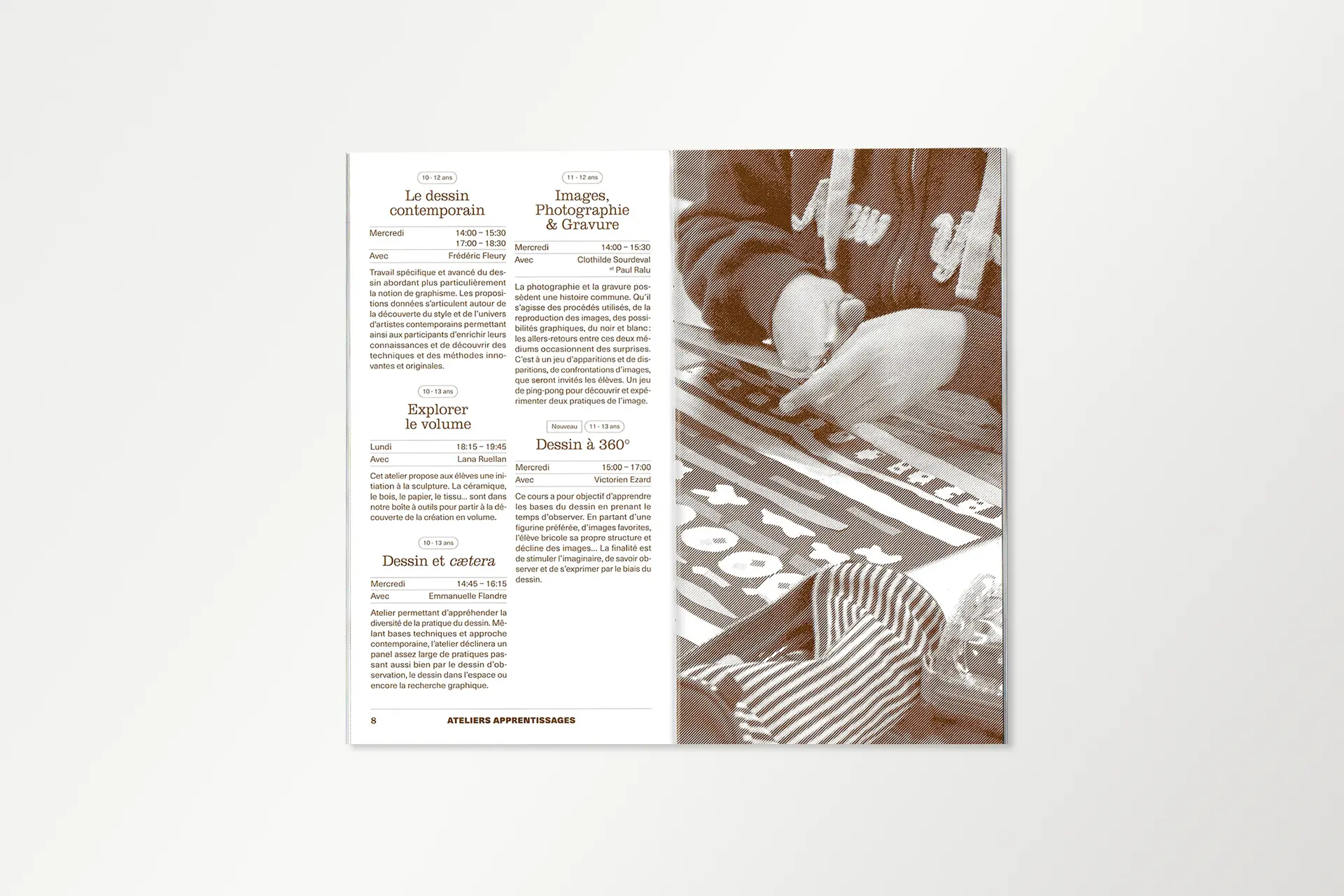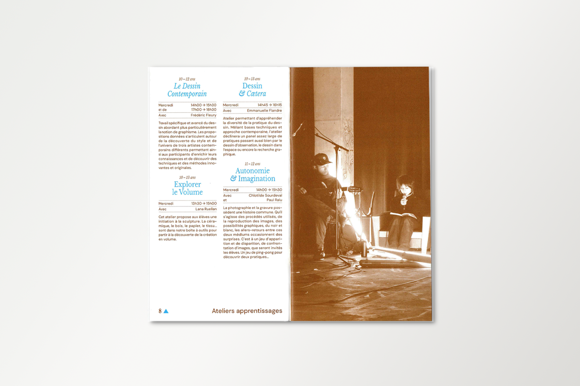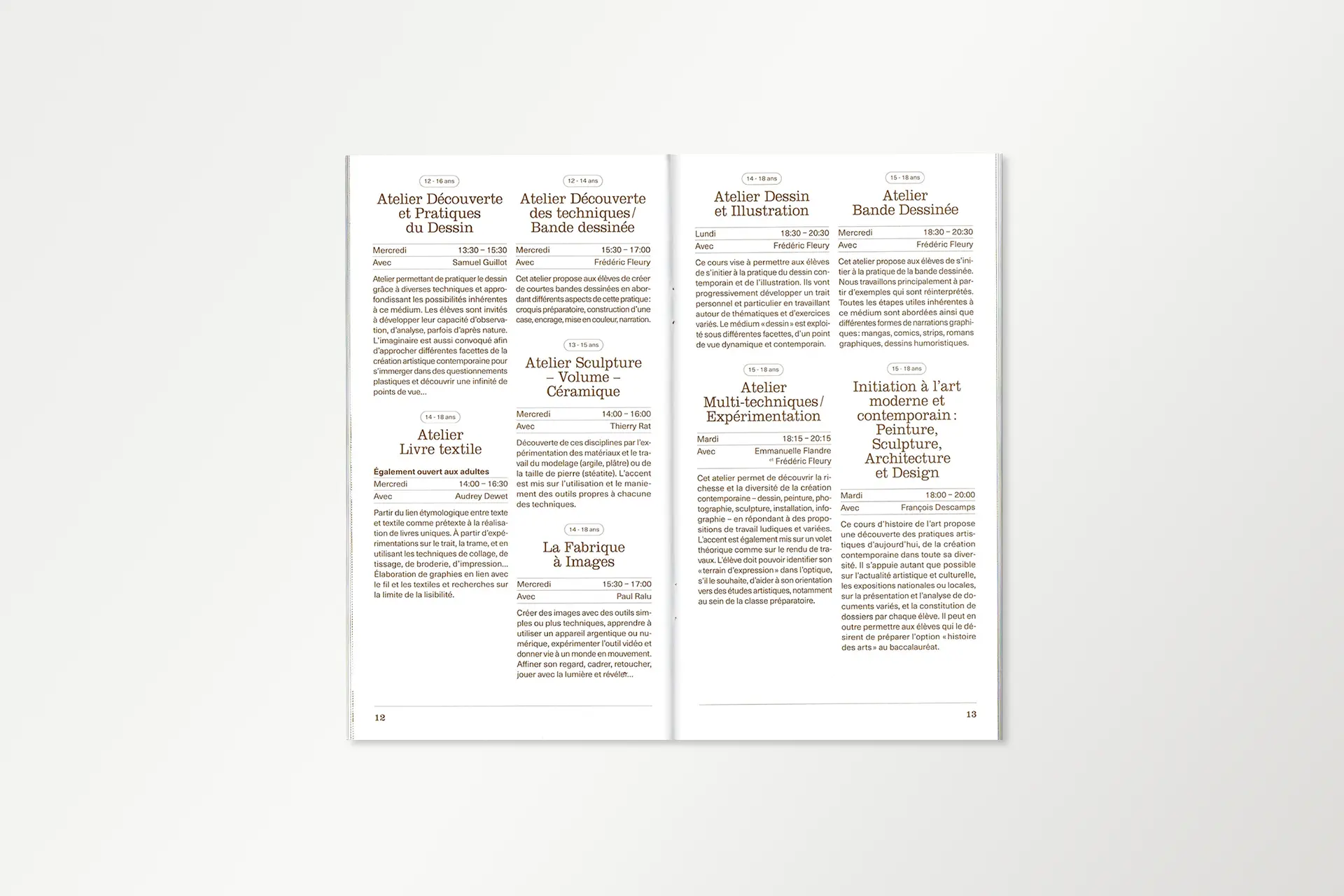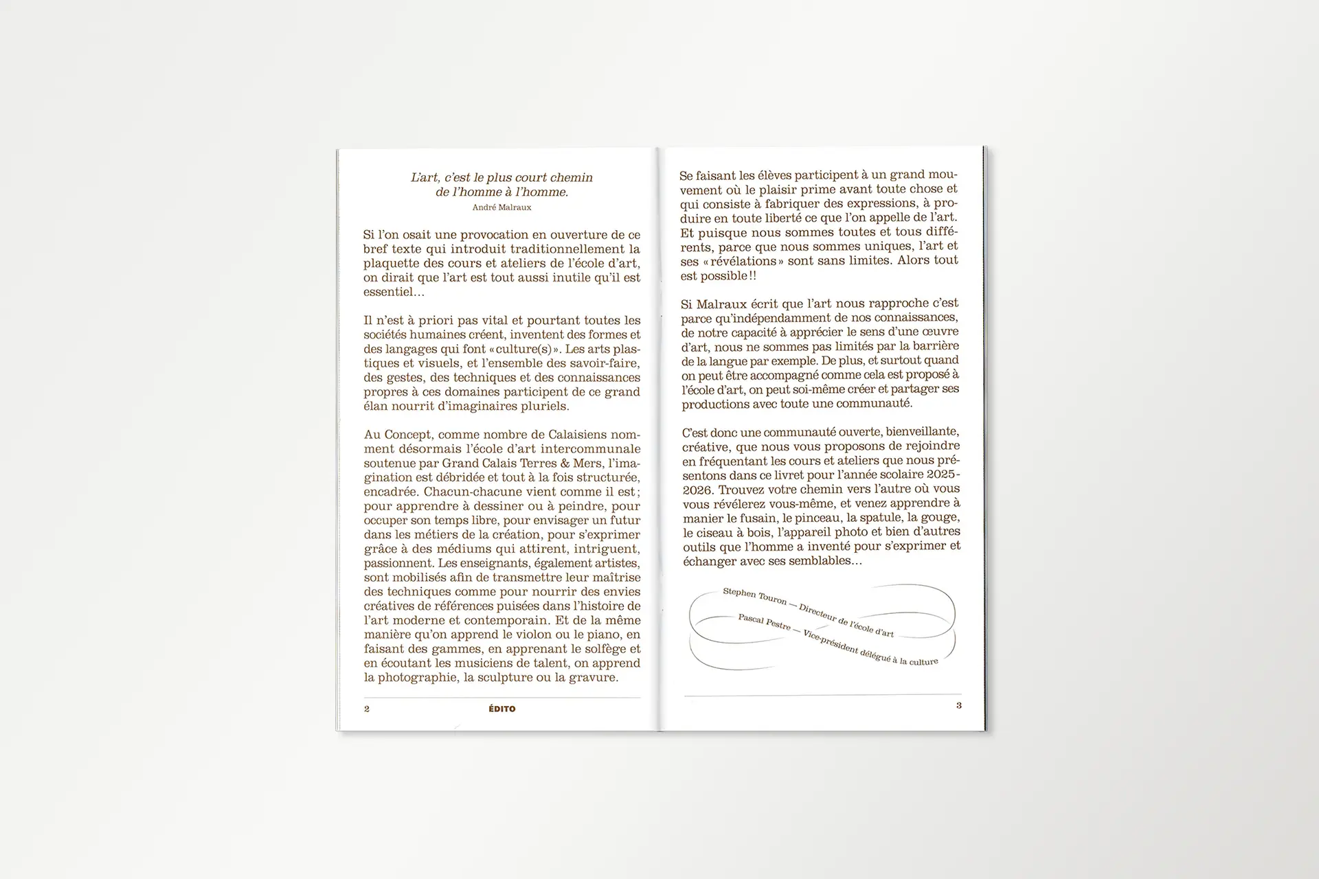 PresseTERRE DE FLUX #1Année2025DescriptionExposition, Affiche, FlyersLieuÉcole d'art du CalaisisTerre de flux est une résidence de création co-organisée par l'École d'Art du Calaisis et l'École d'art et de communication de Cambrai. Cette restitution expose les productions et les recherches développées lors de celle-ci. La communication visuelle de cette exposition est une carte blanche donné au designer lauréat.COURS ET ATELIERS 25/26Année2025DescriptionÉdition, 110 x 200 mm, Pelliculage brillant sur couvertureClientÉcole d'art du CalaisisDans la continuité du dépliant, le livret met en évidence la dentelle de cuivre visible sur la façade de l'école. Celui-ci est couvert d'un pelliculage brillant rendant compte de la brillance du métal à tons dorés.CLASSE PRÉPA 25/26Année2025DescriptionDépliant 4 plis, 240 x 175 mm, vernis UVClientÉcole d'art du CalaisisL’École d’art du Calaisis est située au cœur de la ville de Calais. Elle se distingue notamment par son architecture et par la dentelle de cuivre qui recouvre sa façade. Le dépliant entre en résonance avec l’architecture grâce à des dégradés d’une nuance Pantone. Une forme se développe progressivement au fil du dépliage de l’objet, illustrant ainsi l’évolution de l’étudiant à mesure qu’il découvre l’école et ses enseignements.GOLF DE BLÉRIOT-PLAGEDate2024DescriptionPhotographie, installationLieuCalaisDepuis plusieurs années, Blériot-Plage accueille de nombreux projets d’aménagement urbain, dont celui d’un terrain de golf qui n’a finalement pas abouti. Pourtant, la plage elle-même peut être exploitée sans être dégradée. Les dunes, sculptées par le vent et les marées, sont marquées par un ratissage qui permet l’émergence d’un golf naturel prêt à l’emploi.BASEBALL D'AUTOMNEDate2024DescriptionPhotographie, installationLieuCalaisLa période automnale invite à parcourir la ville, tapissée de feuilles mortes. Ces déchets, habituellement éliminés, peuvent devenir un matériau de construction pour des espaces et des aménagements naturels biodégradables. Inspiré par la forme d’un espace vert, un terrain de baseball émerge de la structuration des feuilles environnantes.COURSES EN CALAISISDate2024DescriptionSérie, Photographie, installationLieuCalaisÀ l’aide de bandes de tissu préalablement conçues pour imiter un damier, l’espace urbain peut être transformé en champ de course par la seule présence de cet élément graphique, et ce, sans marquer, dégrader ou dénaturer le paysage. Ces installations in situ redéfinissent nos usages de la voie publique à travers l’imaginaire sportif.SKATEPARKDate2024DescriptionPhotographie, installationLieuCalaisSkatepark est une série de photographies prises sur le skatepark de Calais, l’un des plus grands de France. Les formes épurées du mobilier facilitent sa réappropriation en lui donnant de nouvelles fonctions. Initialement conçu pour les engins roulants, cet espace voit ses possibilités s’élargir lorsqu’on y utilise un ballon ou d’autres accessoires de jeu, transformant ainsi cet espace figé en un lieu de création sans limite.EN PISTE!Date2024DescriptionPeinture, piste de jeuxLieuNiergniesTracée sur une ancienne piste aérienne d’une longueur de 200 mètres, En piste! est une accumulation de compositions géométriques inspirées de jeux populaires, tels que des jeux de balle, de lancer, de course ou encore des jeux de plateau. Ces différentes typologies de jeux se réunissent et s’entremêlent, offrant de multiples possibilités d’interprétation et d’utilisation. Les participant·es sont libres d’interpréter ces espaces, de les investir et d'y créer leurs propres règles.COURS ET ATELIERS 24/25Date2024DescriptionÉdition, 110 x 200 mmCommanditaireÉcole d'art du CalaisisLe livret 2024-2025 à destination des futur·es adhérent·es de l’École d’art du Calaisis est imaginé comme étant un objet ludique et accessible à un public de tout âge. Chaque tranche d’âge est assimilée à une forme géométrique et une couleur, en écho aux jeux de construction mais également à des gomettes. De leurs déploiements émergent des images propres à chacun·e.LES NOUVEAUX STADESDate2024DescriptionEspace de création collectiveLieuAgglomération de CambraiCollaborationLes Nouveaux Stades ont pour objet de favoriser la réappropriation de l’espace public par les habitant·es d’un quartier, grâce à l’invention de nouveaux rituels inclusifs. Au croisement du foot de rue, du hip hop et du jeu vidéo, Les Nouveaux Stades accueillent des performances chorégraphiques impliquant sportif·ves amateur·es, danseur·euses et habitant·es.REVUE MULTIPLEX IIDate2024DescriptionÉdition 240 x 320 mmCommanditaireAssociation PolarisFaisant suite à la journée Multiplex II en décembre 2023, cette revue éponyme rend compte de chaque événement ainsi que du travail des étudiant·es de chaque école représentée. L’ouvrage met en lumière les recherches et les questionnements des écoles d’art des Hauts-de-France.MULTIPLEX IIDate2023DescriptionIdentité visuelle, signalétiqueCommanditaireAssociation PolarisL’identité visuelle de Multiplex II se manifeste par une explosion éléctrisante de couleurs chaudes. Cette étincelle émane de la rencontre entre les écoles d’art réparties dans les quatres coins de la région Nord. Celle-ci témoigne du dynamisme constant de l’événement à travers la présentation des diverses pratiques et programmes de recherches.ASSOCIATION POLARISDate2023DescriptionLogotypeCommanditaireAssociation PolarisCe logotype allie le concept de géolocalisation, représenté par une boussole, et le rayonnement de l’association représenté par une étoile. Basé sur le nom entier de l’association «Réseau magnétique des écoles d’art publiques des Hauts-de-France», le choix d’une boussole comme instrument magnétique résume la volon
